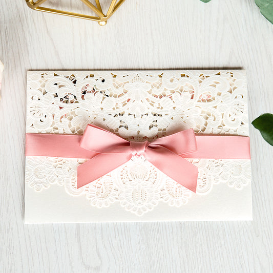White Hollow Flora Laser Cut Invitations with Gold Glitter Border and Pink Ribbons for wedding,bridal shower
