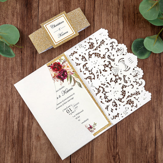 White Hollow Flora Laser Cut Invitations with Gold Glitter Border and Glitter Belly Band for wedding,bridal shower