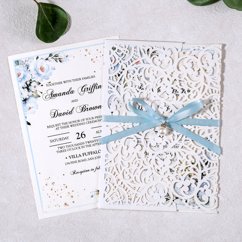 The details are the most important part of your wedding invitations. Keep them simple and stick to the basics! You’ll need to include the date, time, location and address. In many formal invitations, couples will spell out the date and time.