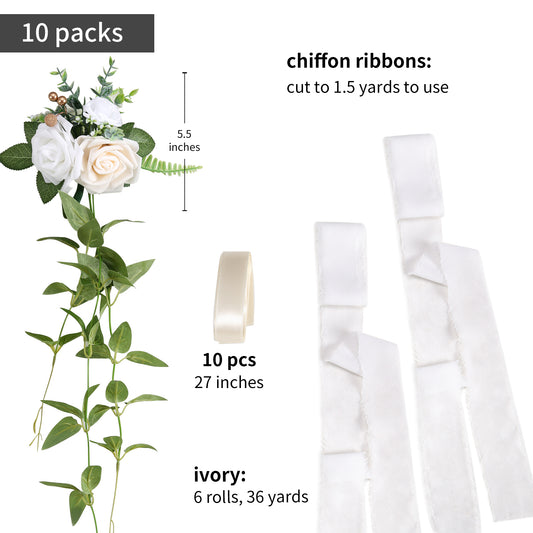 Wedding Aisle Decorations White Pew Flowers Set of 10 for Wedding Ceremony Party Chair Decor with Artificial Flowers Eucalyptus and Ribbons