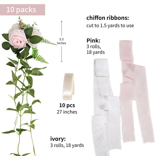 Wedding Aisle Decorations Pink Pew Flowers Set of 10 for Wedding Ceremony Party Chair Decor with Artificial Flowers Eucalyptus and Ribbons