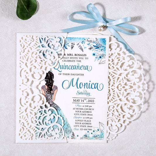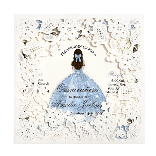 Customized Quinceanera Invitation Dusty Blue, Elegant 15 years Invitations Sweet 16, Miss XV, Birthday Laser Cut Quince Invitation Cards White Personalized