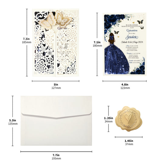 Butterfly Quinceanera Invitation Navy Blue for 15 year, Sweet 16, Miss XV, Birthday Laser Cut Quince Invitation Cards Personalized Ivory White