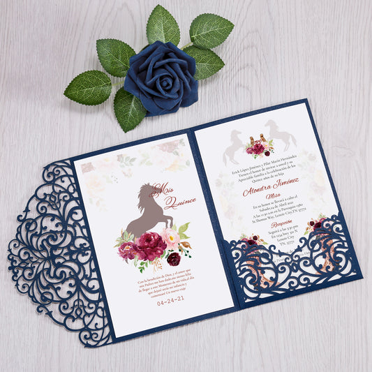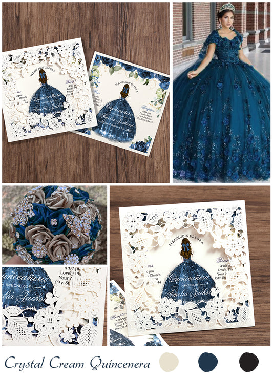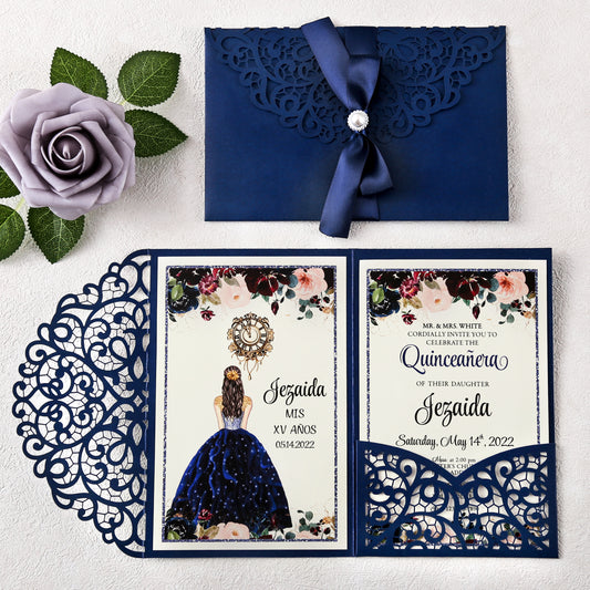 Customized Quinceanera Invitation Navy Blue, Elegant 15 years Invitations Sweet 16, Miss XV, Birthday Laser Cut Quince Invitation Cards White Personalized
