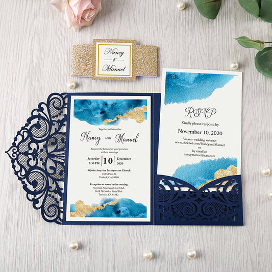 Pearlized Blue Floral Laser cut Wedding Invitation with Glitter Gold Bellyband for Wedding, Anniversary, Quinceanera