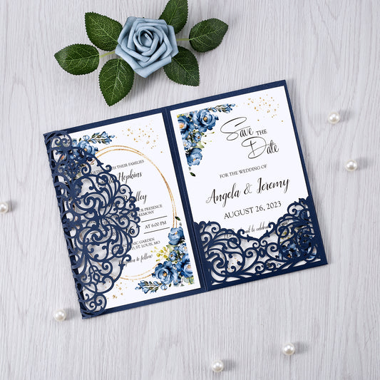 DreamBuilt 4.7 x7 inch Navy Blue Laser Cut Wedding Invitations With Envelopes Kit Hollow Rose Pocket And Gold Glitter Belly Band for Wedding Bridal Shower Engagement Invite