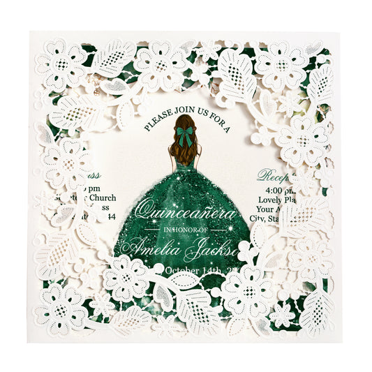 Customized Quinceanera Invitation Emerald Green, Elegant 15 years Invitations Sweet 16, Miss XV, Birthday Laser Cut Quince Invitation Cards White Personalized