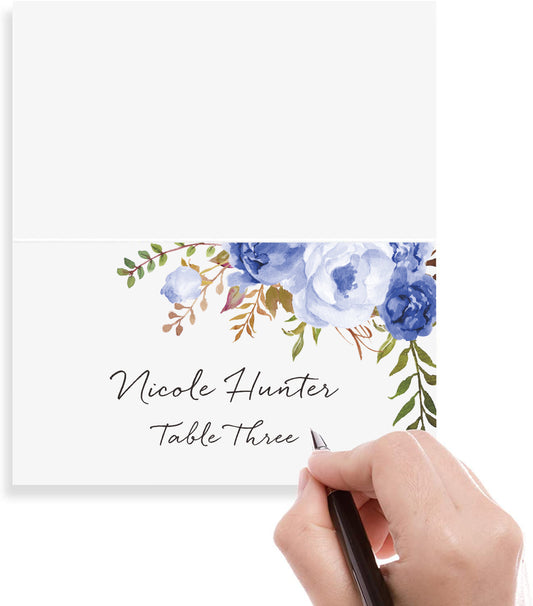 Floral Place Cards for Wedding or Party, Seating Place Cards for Tables, Scored for Easy Folding, Blue Flower Design, 2 x 3.5 Inches