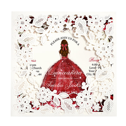 Customized Quinceanera Invitation Red, Elegant 15 years Invitations Sweet 16, Miss XV, Birthday Laser Cut Quince Invitation Cards White Personalized