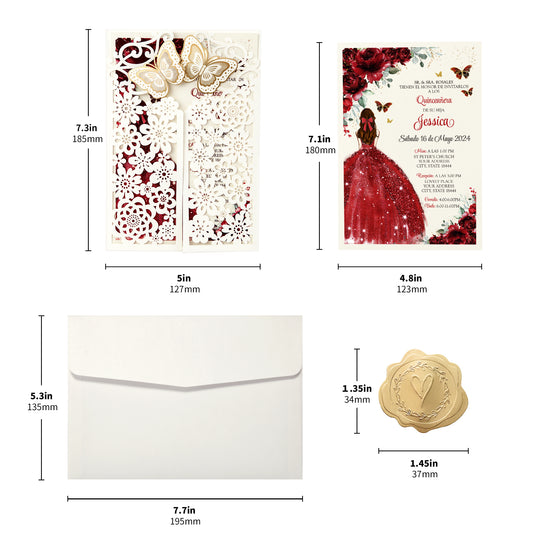 Butterfly Quinceanera Invitation Red for 15 year, Sweet 16, Miss XV, Birthday Laser Cut Quince Invitation Cards Personalized Ivory White