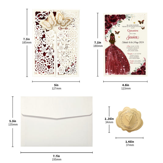 Butterfly Quinceanera Invitation Burgundy for 15 year, Sweet 16, Miss XV, Birthday Laser Cut Quince Invitation Cards Personalized Ivory White