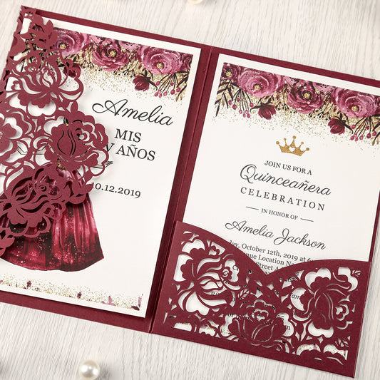 Burgundy Floral Laser cut invitation cards for Quinceanera