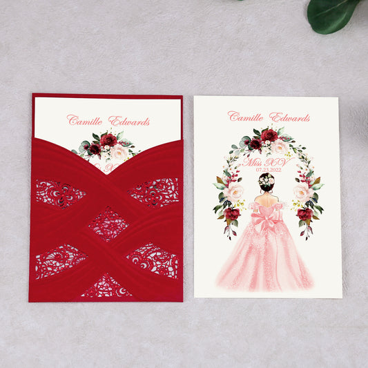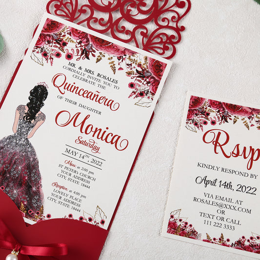 Customized Quinceanera Invitation Red, Elegant 15 years Invitations Sweet 16, Miss XV, Birthday Laser Cut Quince Invitation Cards Red Personalized
