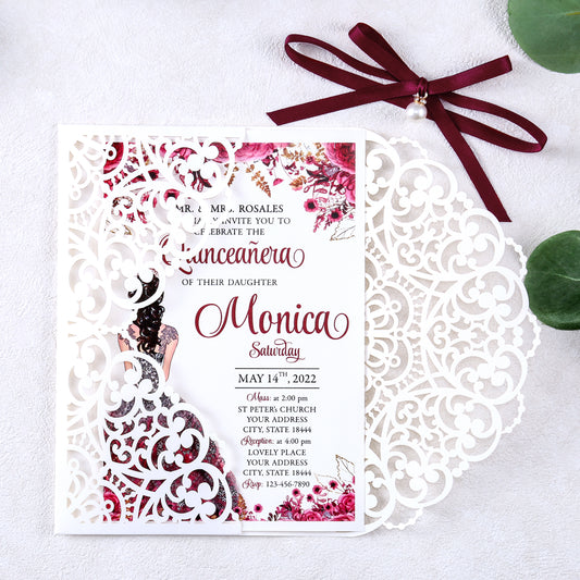 Customized Quinceanera Invitation Burgundy, Elegant 15 years Invitations Sweet 16, Miss XV, Birthday Laser Cut Quince Invitation Cards White Personalized