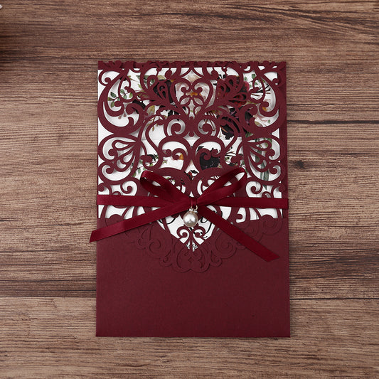 DreamBuilt Burgundy Floral Laser cut invitation cards with ribbon bellyb band and pearl for wedding