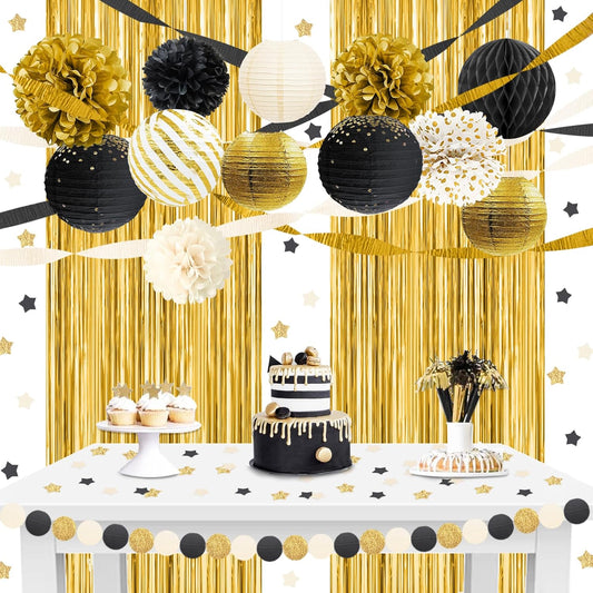 DreamBuilt 2025 New Years Eve Party Decorations, 22 PCS Gold Metallic Foil Fringe Backdrop Curtains Paper Lanterns Tissue Pom Poms Decor for Black Gold Party Supplies, Wedding, Birthday, Graduation