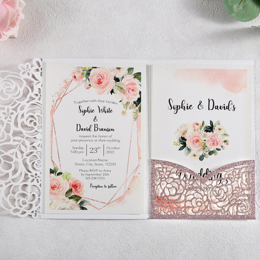 DreamBuilt 4.7 x7 inch Rose Gold Laser Cut Hollow Rose Wedding Invitations Cards with Glitter Pockets and Envelopes for Wedding Bridal Shower