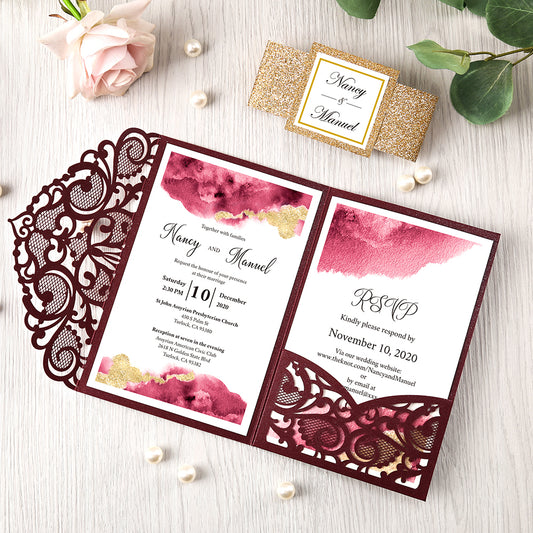 Pearlized Burgundy Floral Laser cut Wedding Invitation with Glitter Gold Bellyband for Wedding, Anniversary, Quinceanera