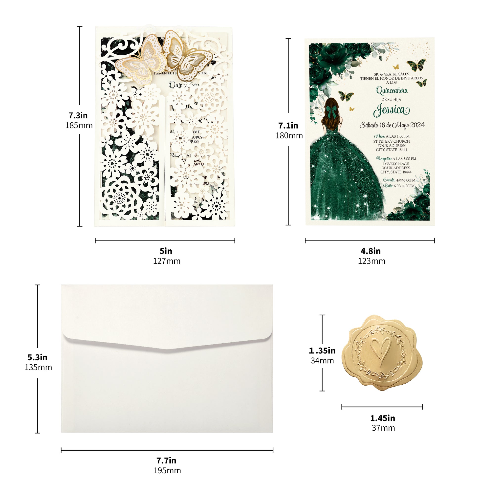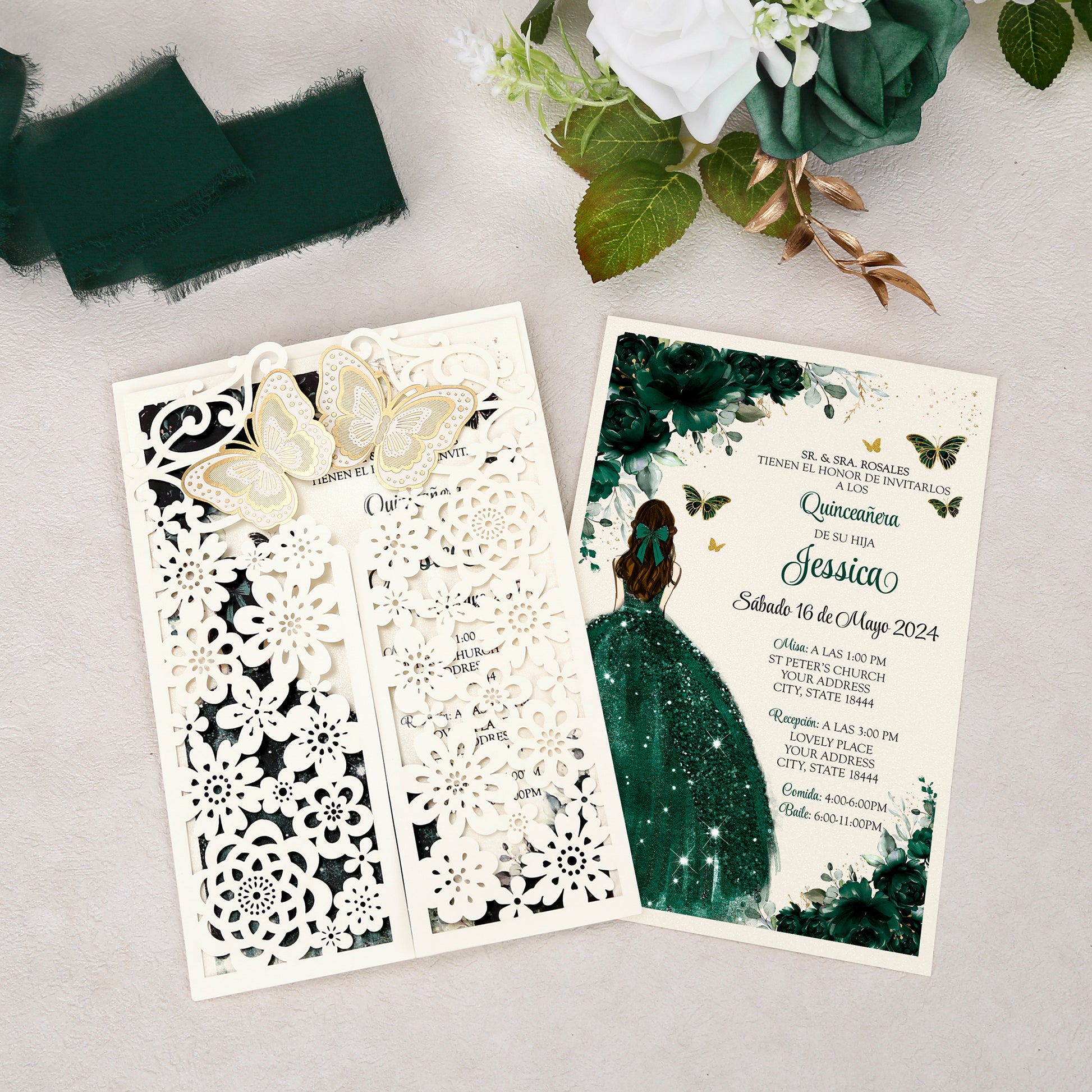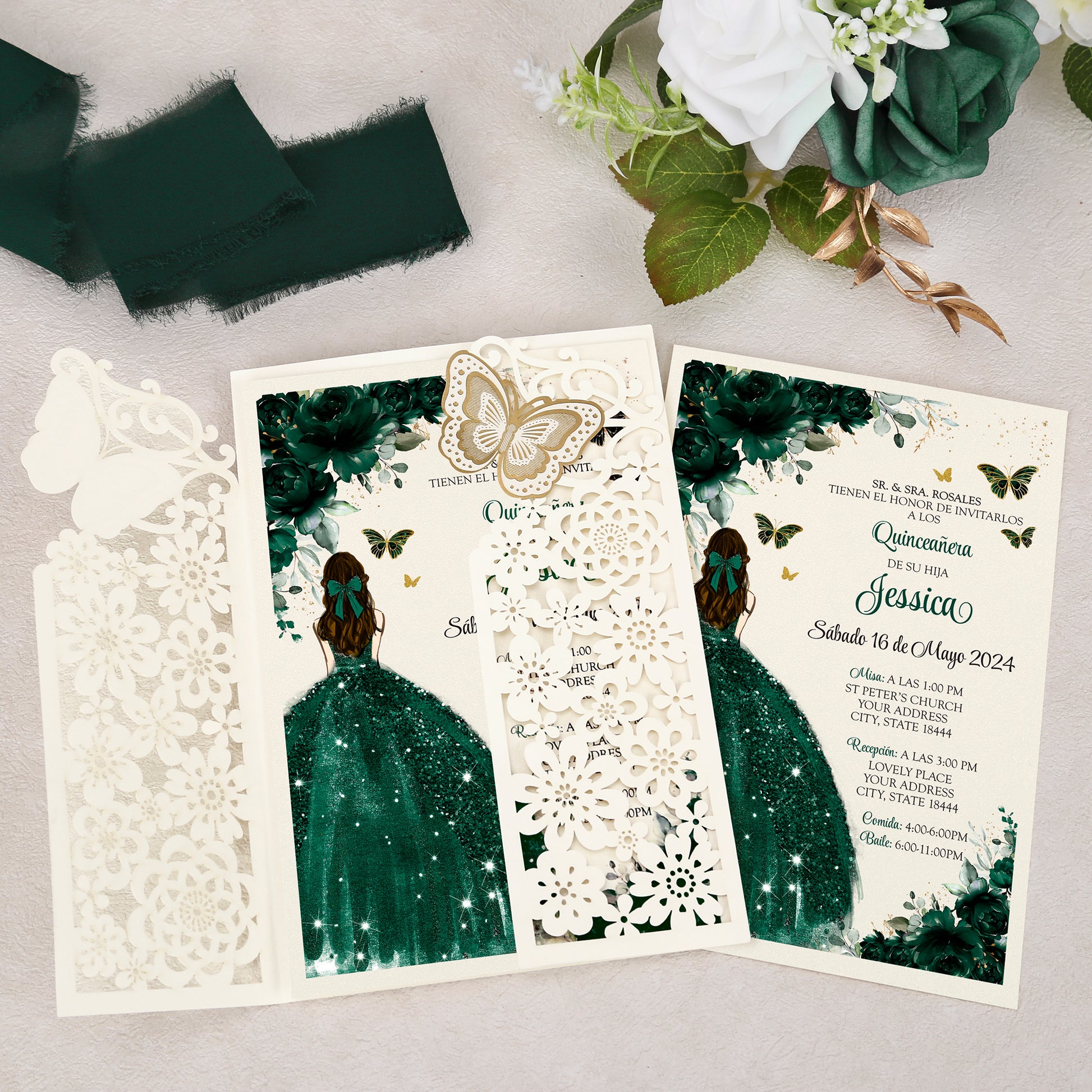 Butterfly Quinceanera Invitation Emerald Green for 15 year, Sweet 16, Miss XV, Birthday Laser Cut Quince Invitation Cards Personalized Ivory White