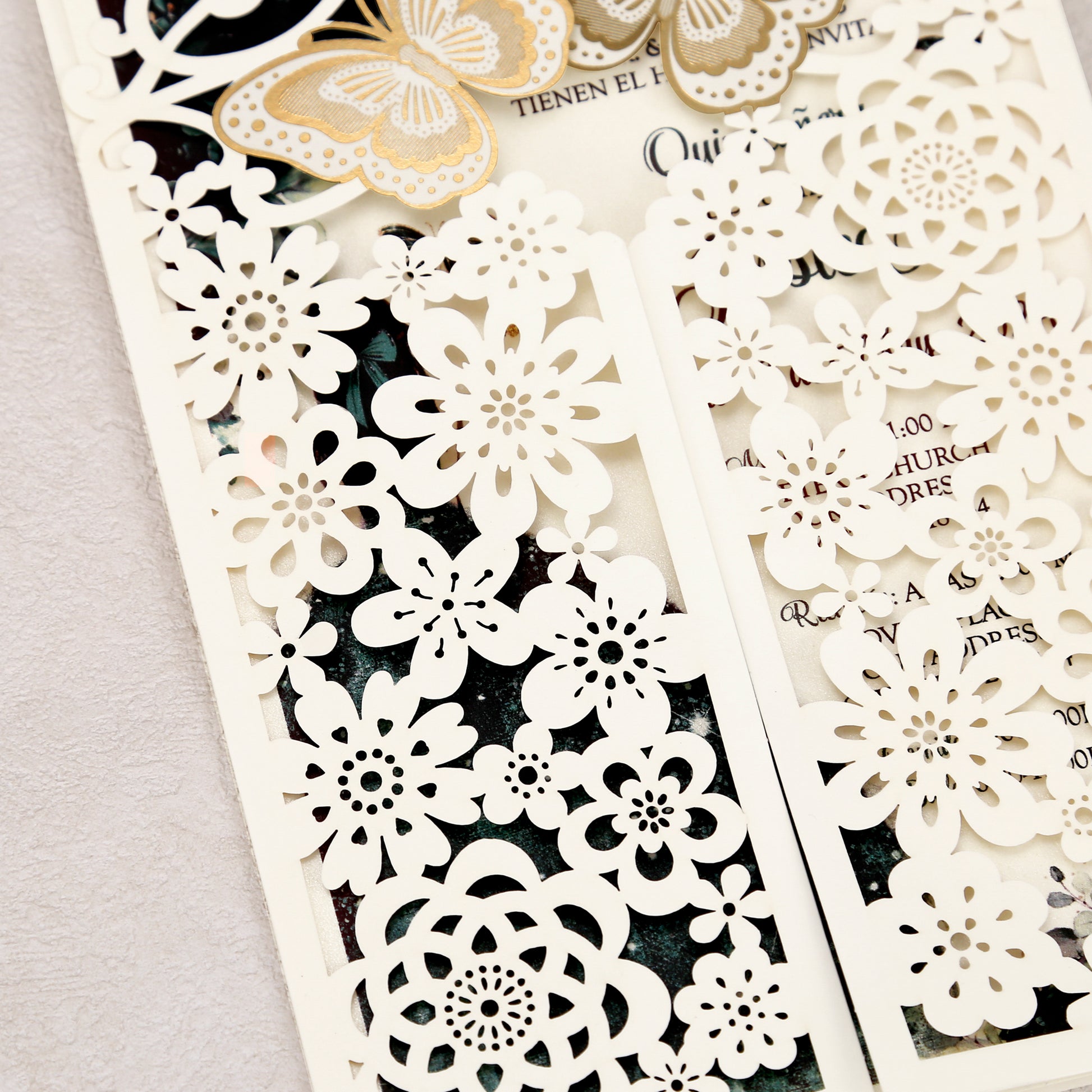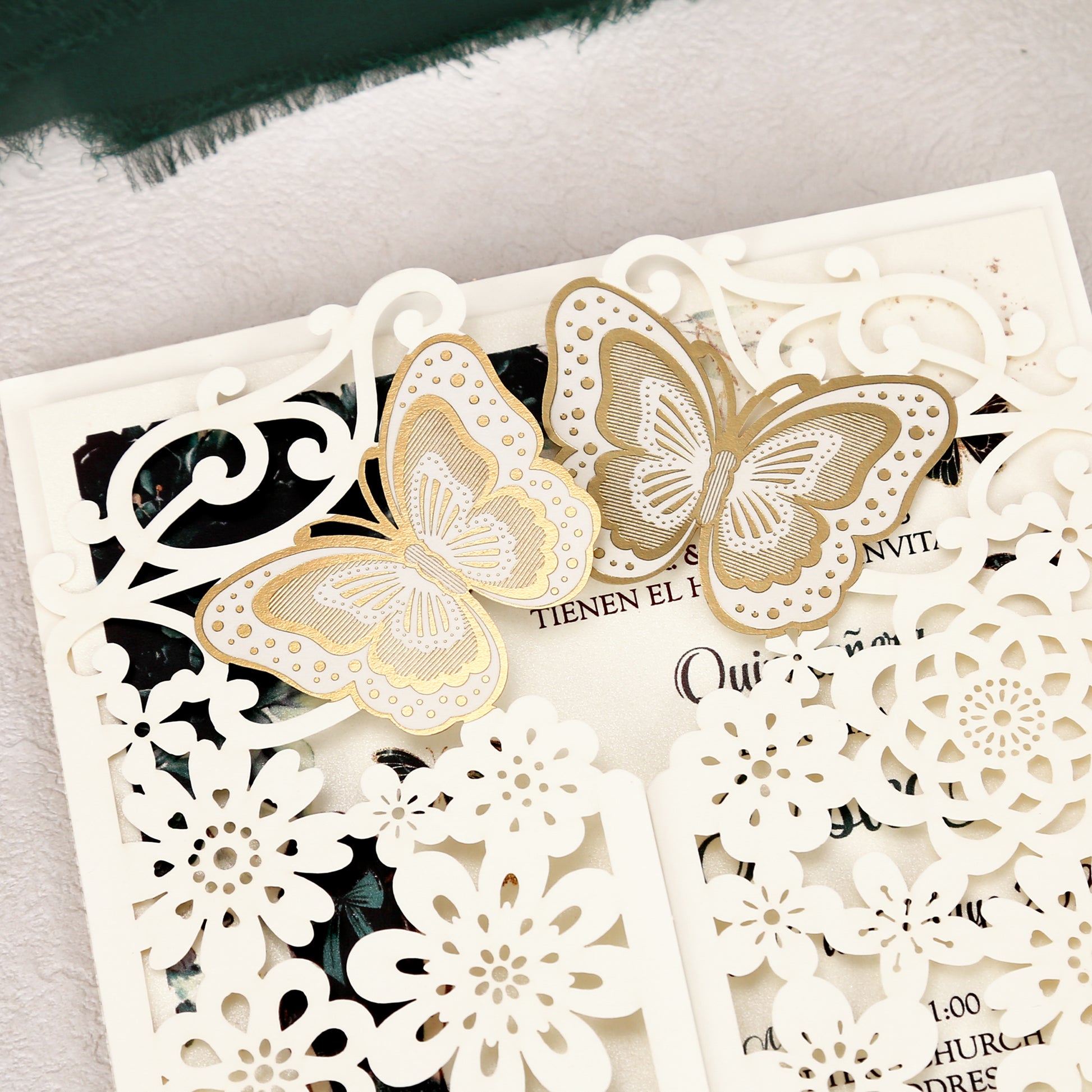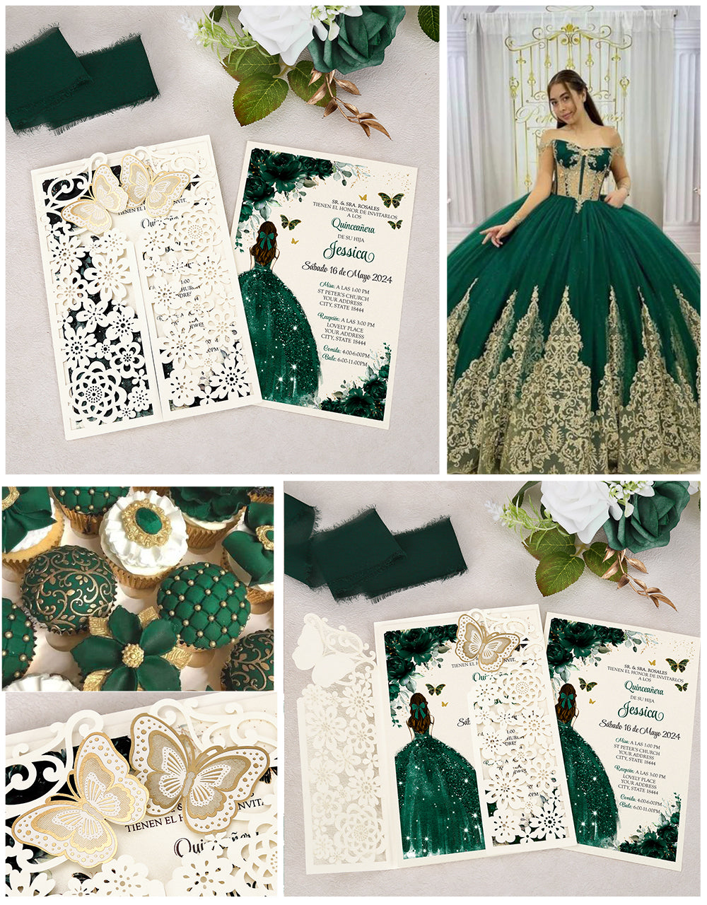 Butterfly Quinceanera Invitation Emerald Green for 15 year, Sweet 16, Miss XV, Birthday Laser Cut Quince Invitation Cards Personalized Ivory White