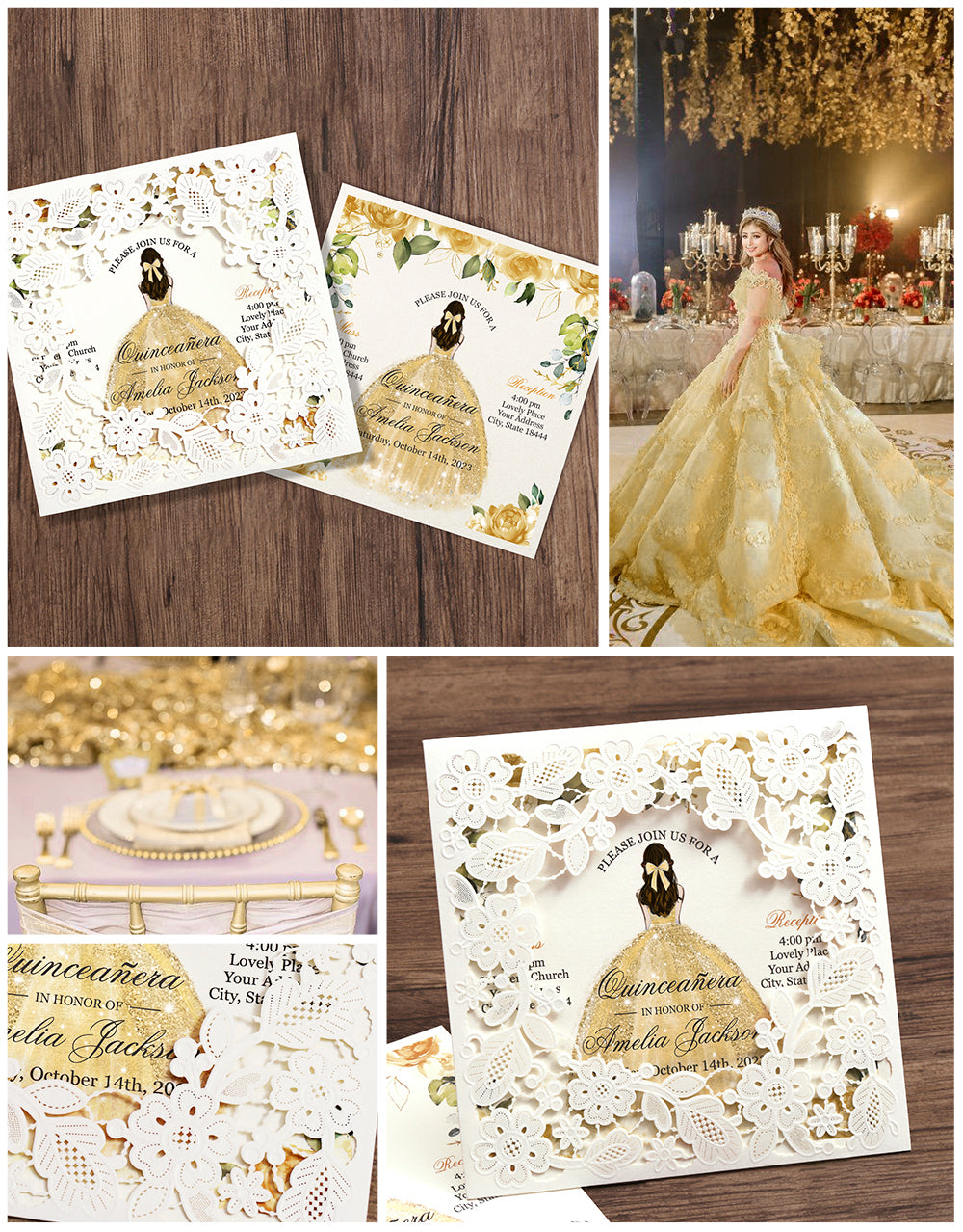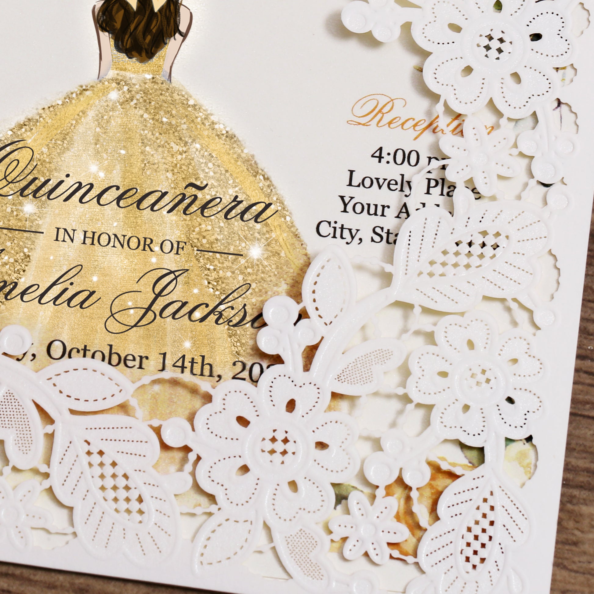 Customized Quinceanera Invitation Gold, Elegant 15 years Invitations Sweet 16, Miss XV, Birthday Laser Cut Quince Invitation Cards White Personalized