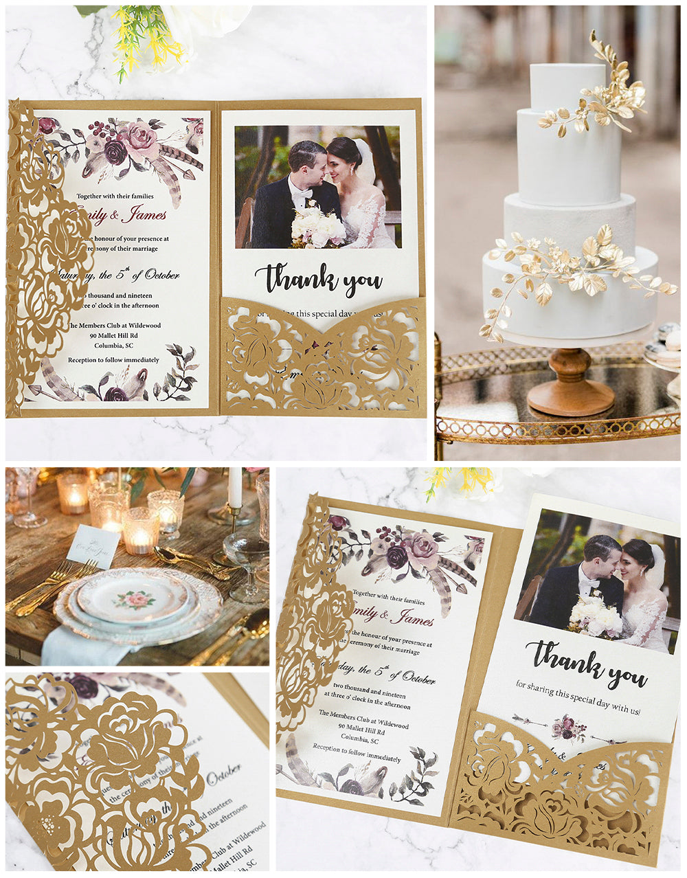 Gold Floral Laser cut invitation cards for Wedding, Anniversary