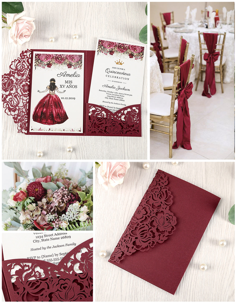 Burgundy Floral Laser cut invitation cards for Quinceanera
