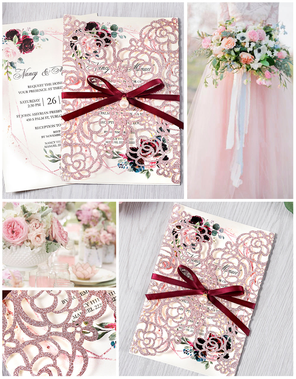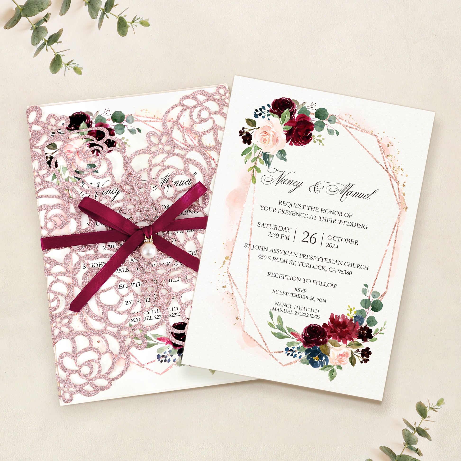 Rose Gold Glitter Floral Laser cut invitation cards with Burgundy Ribbon and Pearl for Wedding Anniversary