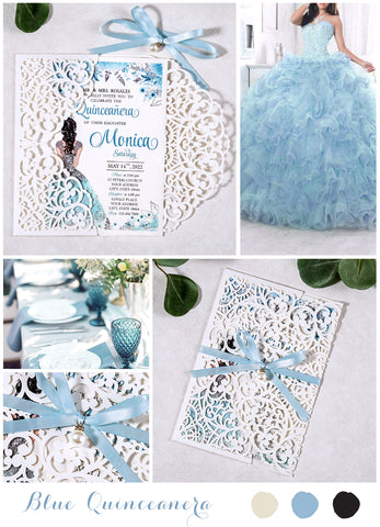 DreamBuilt 5 X 7.2" Laser Cut Hollow Rose Quinceanera invitations Cards With Blue Ribbon And Envelopes For Quinceanera Sweet 15 Invite