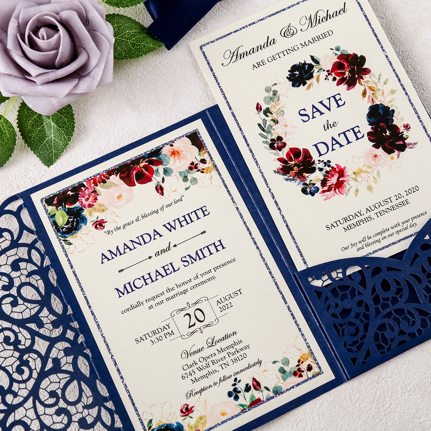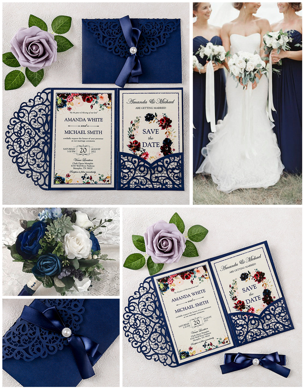 4.7 x7 inch Blue Laser Cut Hollow Rose Wedding Invitations Cards with Envelopes for Wedding Party