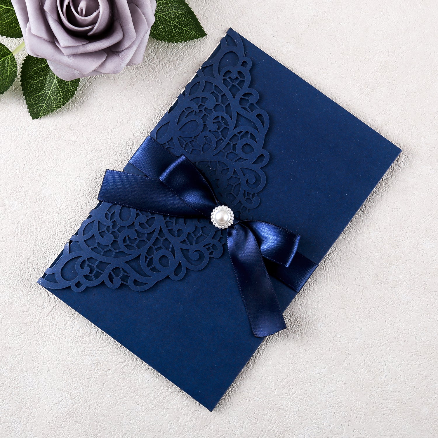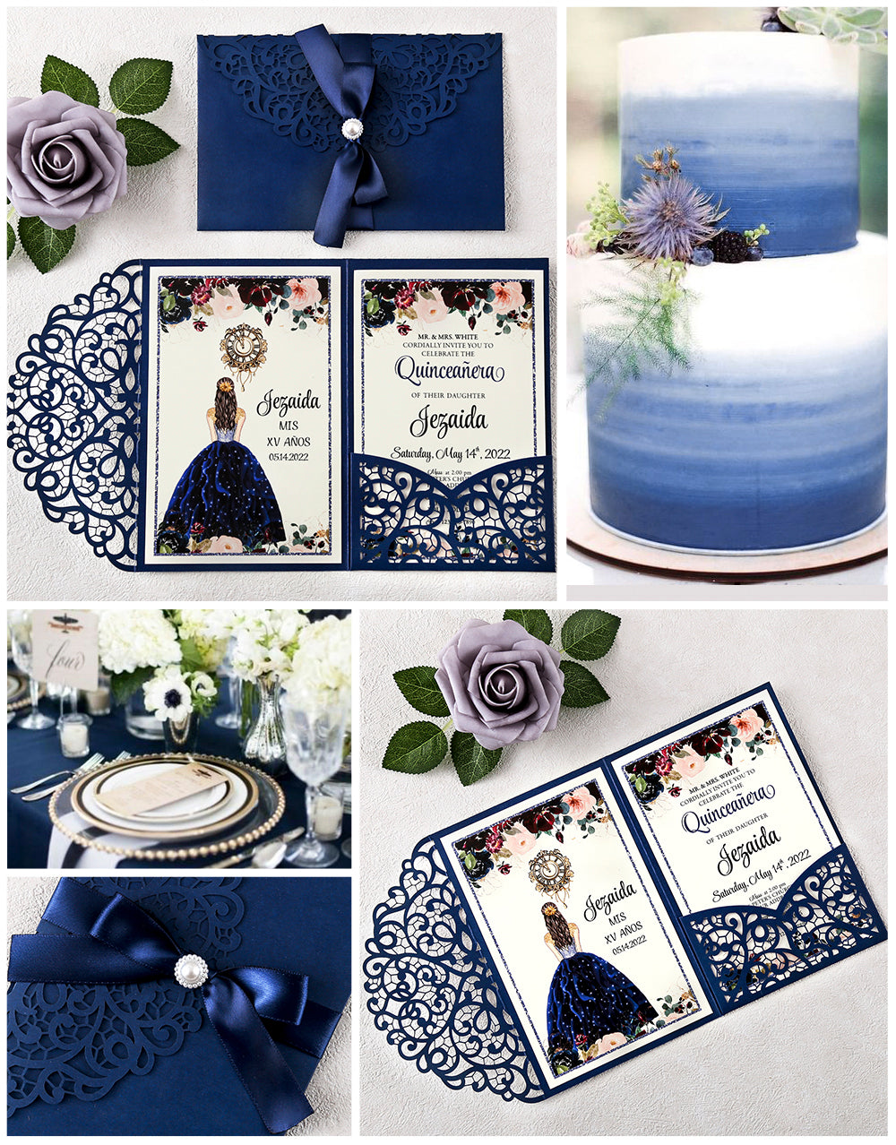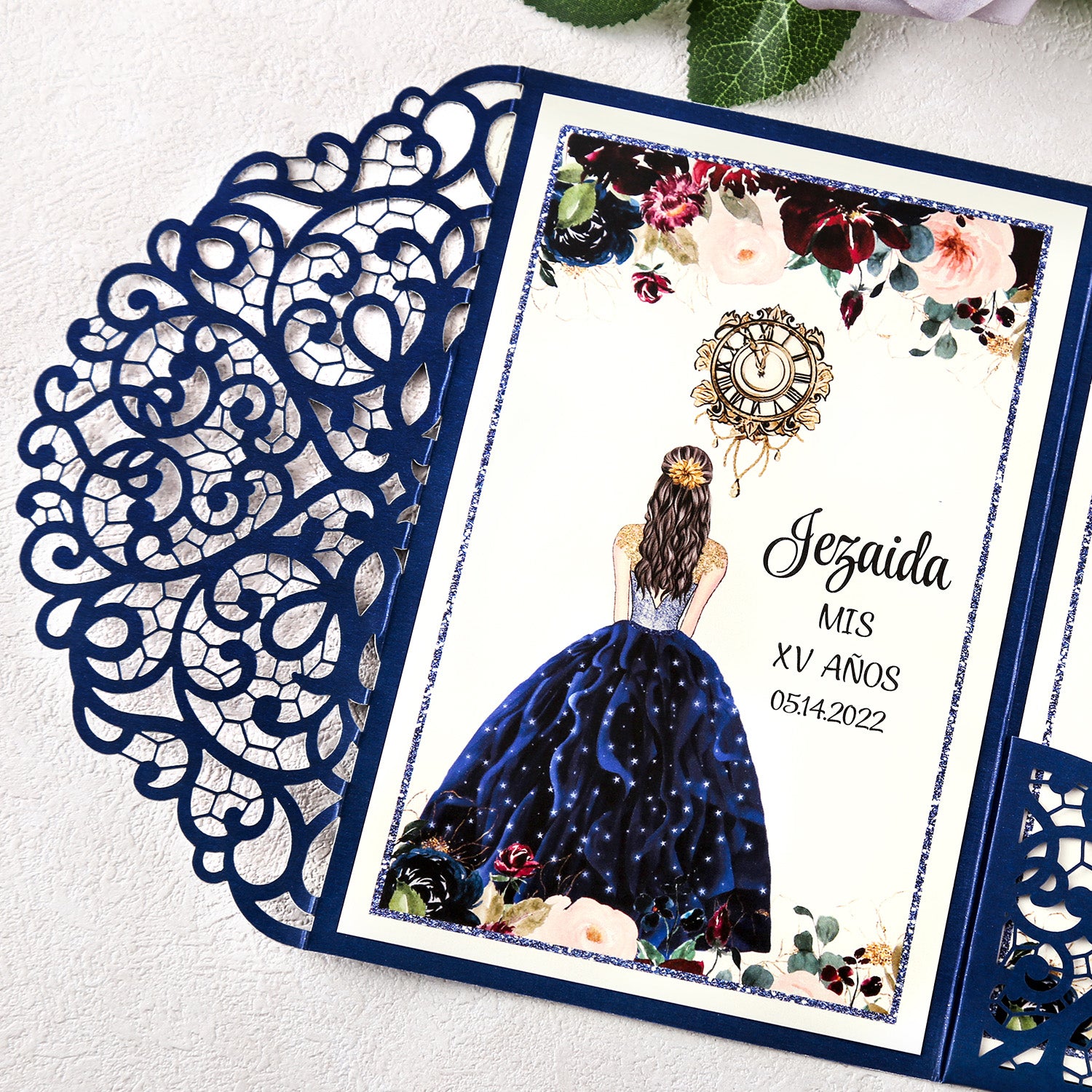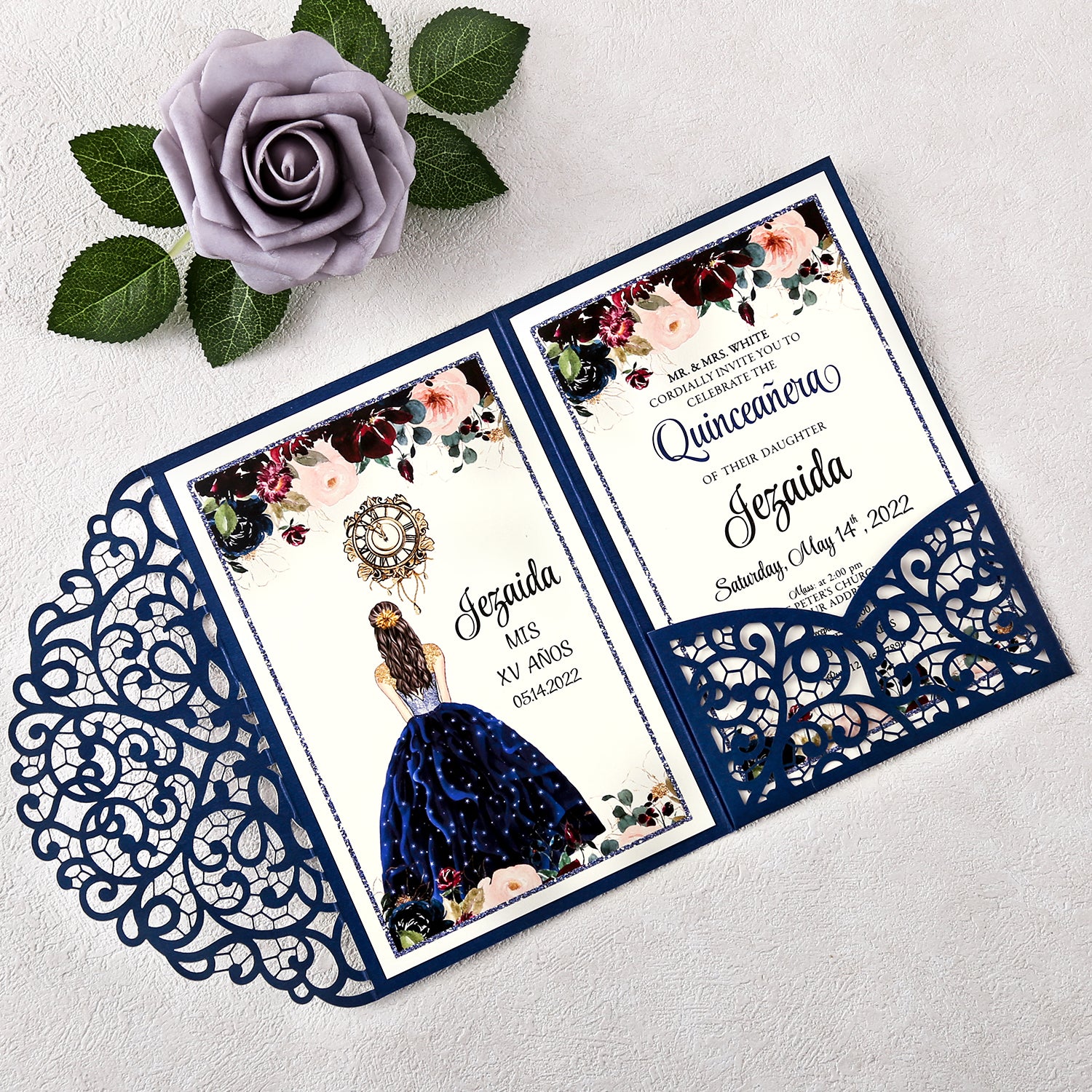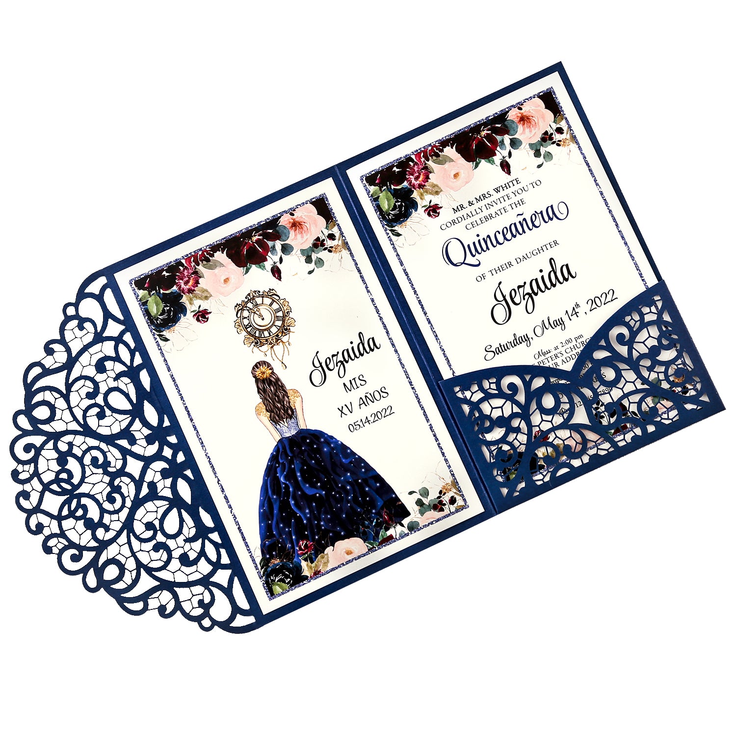 4.7 x7 inch Blue Laser Cut Hollow Rose Quinceanera Invitations Cards with Envelopes for Quinceanera Party