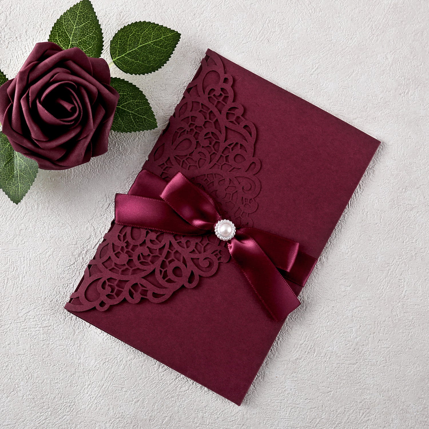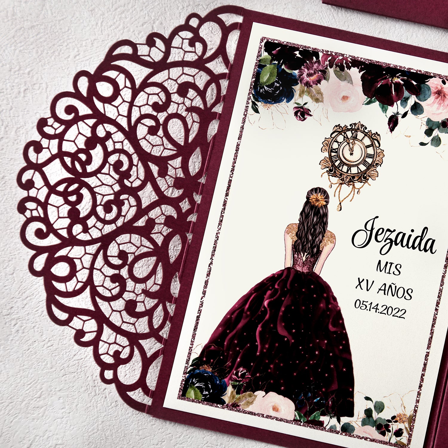 4.7 x7 inch Burgundy Laser Cut Hollow Rose Quinceanera Invitations Cards with Envelopes for Quinceanera Party
