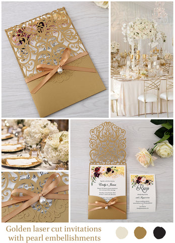 DreamBuilt Gold Floral Laser Cut Invitation Card With Belly Band And Pearl For Wedding Anniversary
