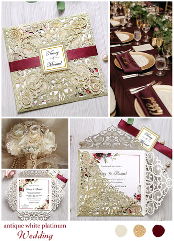 DreamBuilt Square Glitter Gold Wedding Invitations with Burgundy Ribbon Belly Band for Wedding
