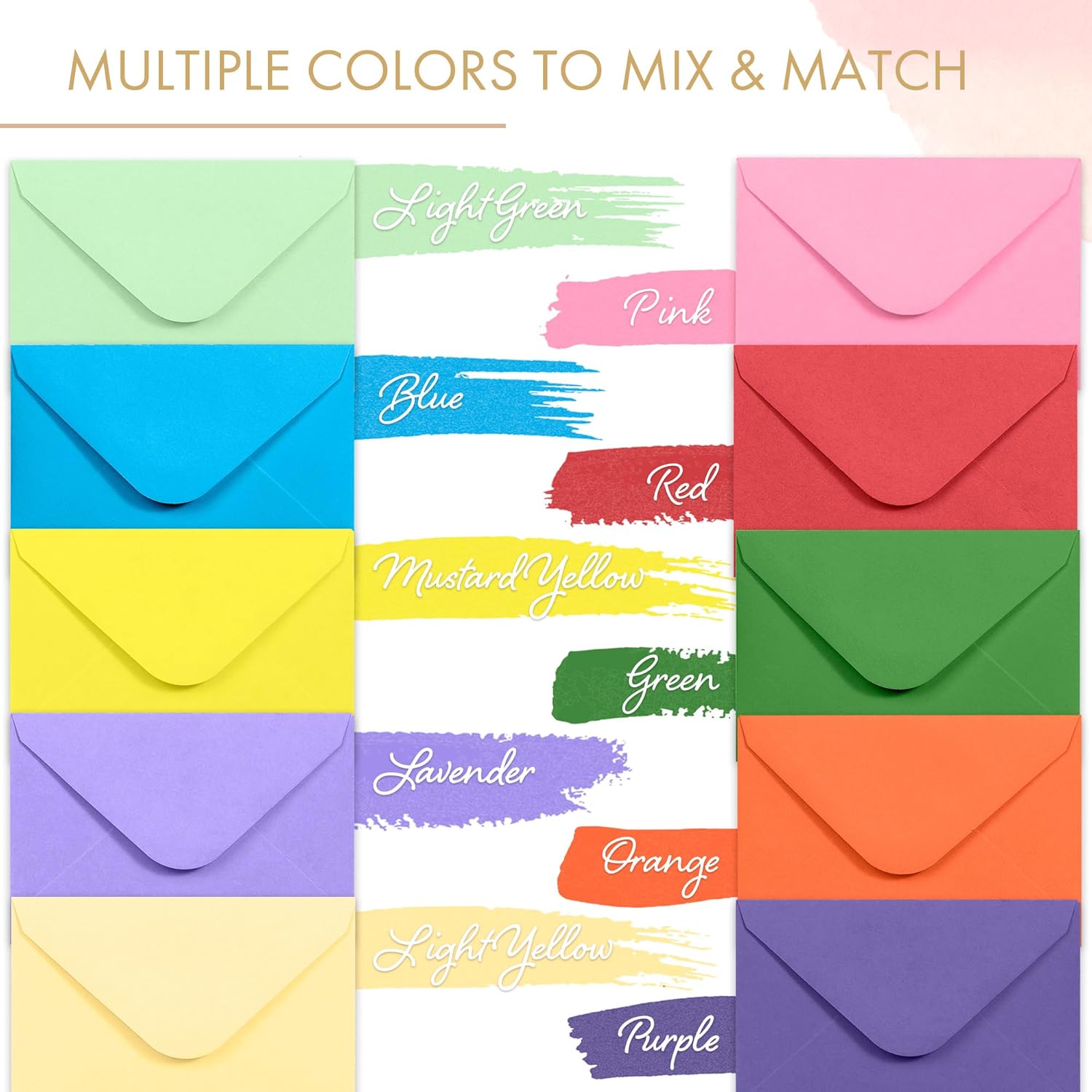 10 COLOR MINI ENVELOPES: Perfect sized paper envelopes for gift cards, wedding placeholders, name cards, gift cards, thank you notes, gift tags and more! They come in the colors red, orange, mustard yellow, green, purple, pink, blue, light, yellow, light green, and lavender.