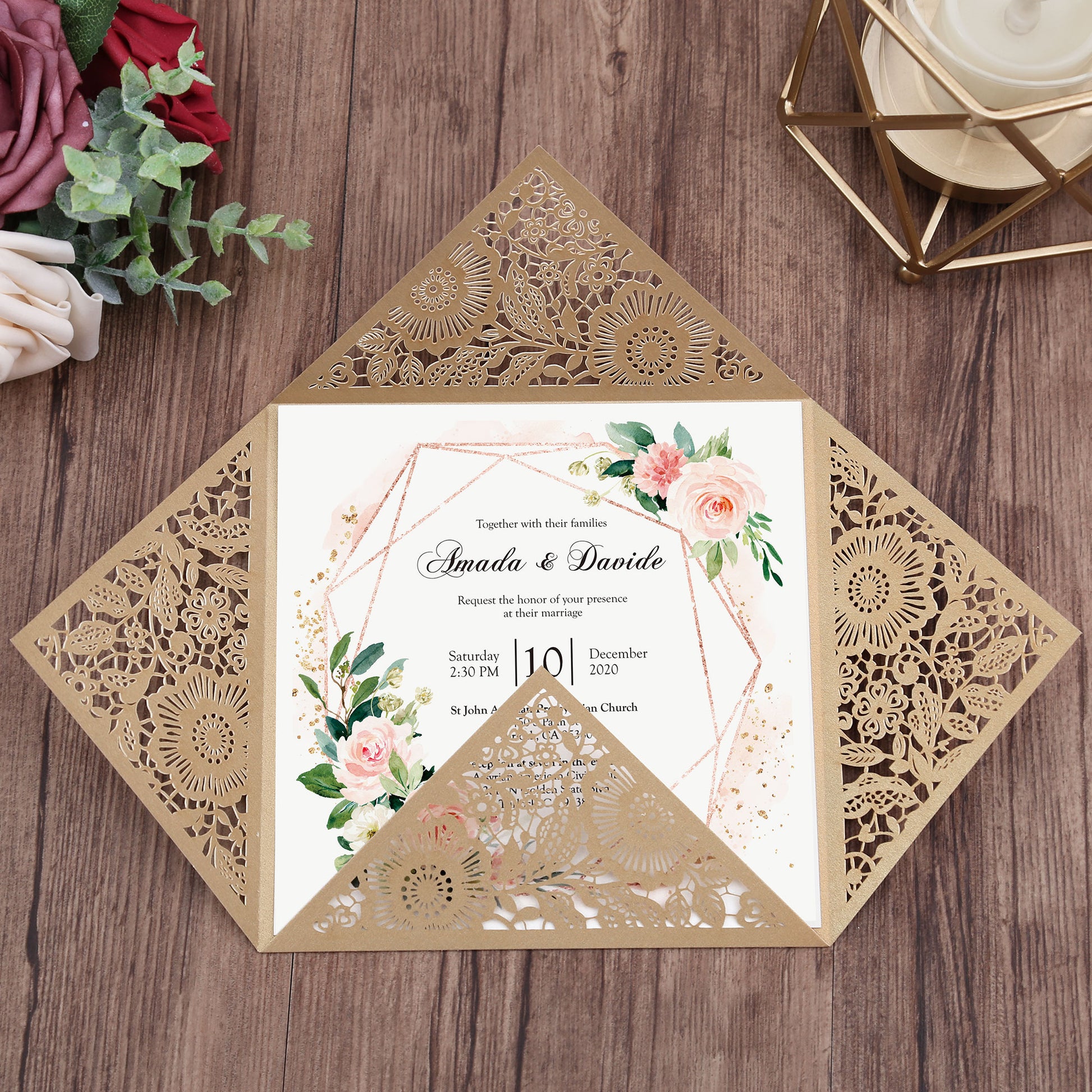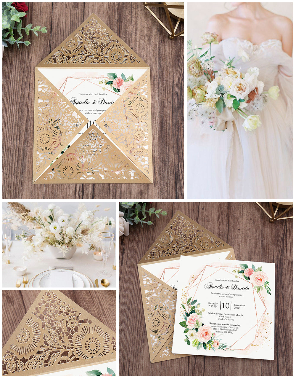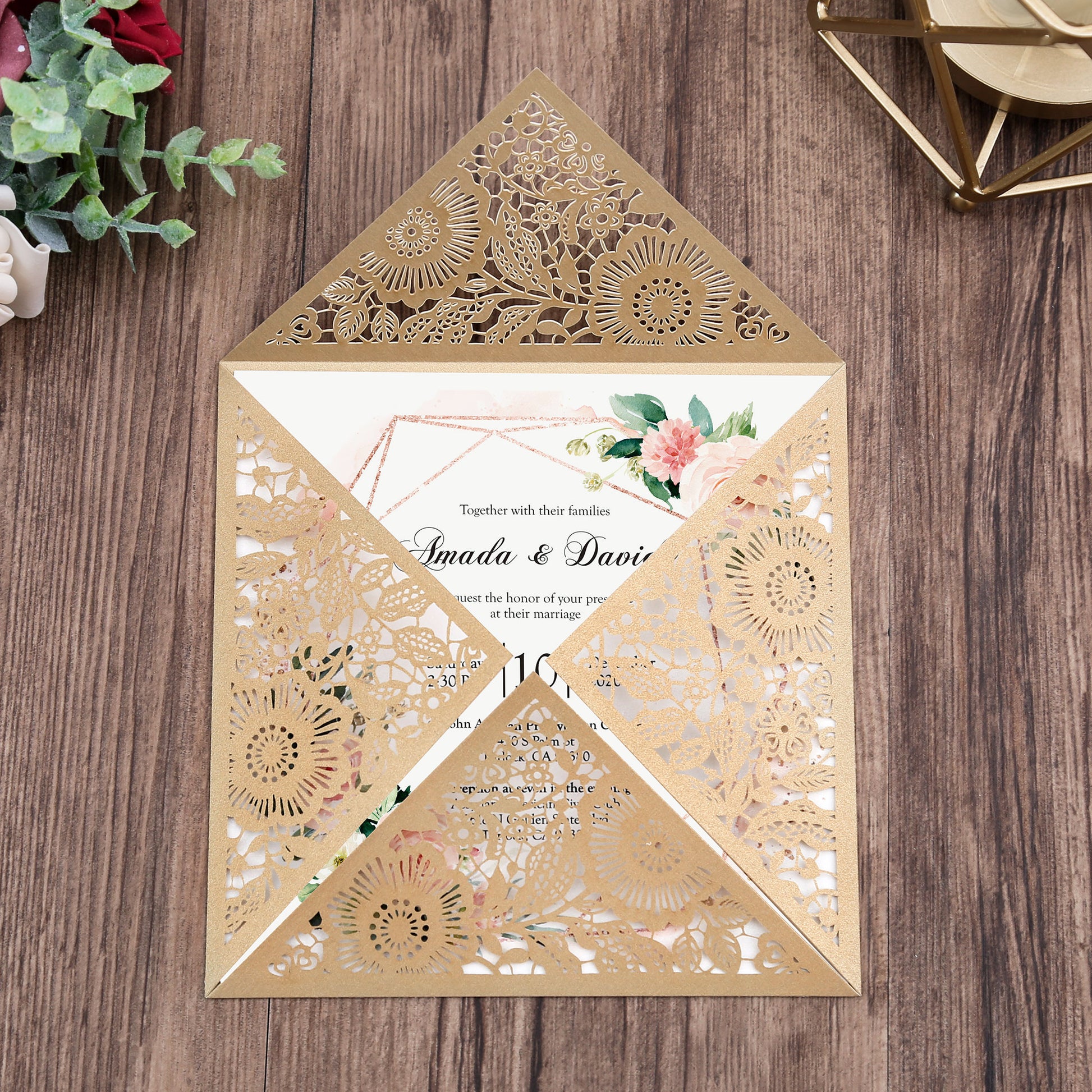 Square Gold Lase-cut Lace Flower Pattern Wedding Invitations