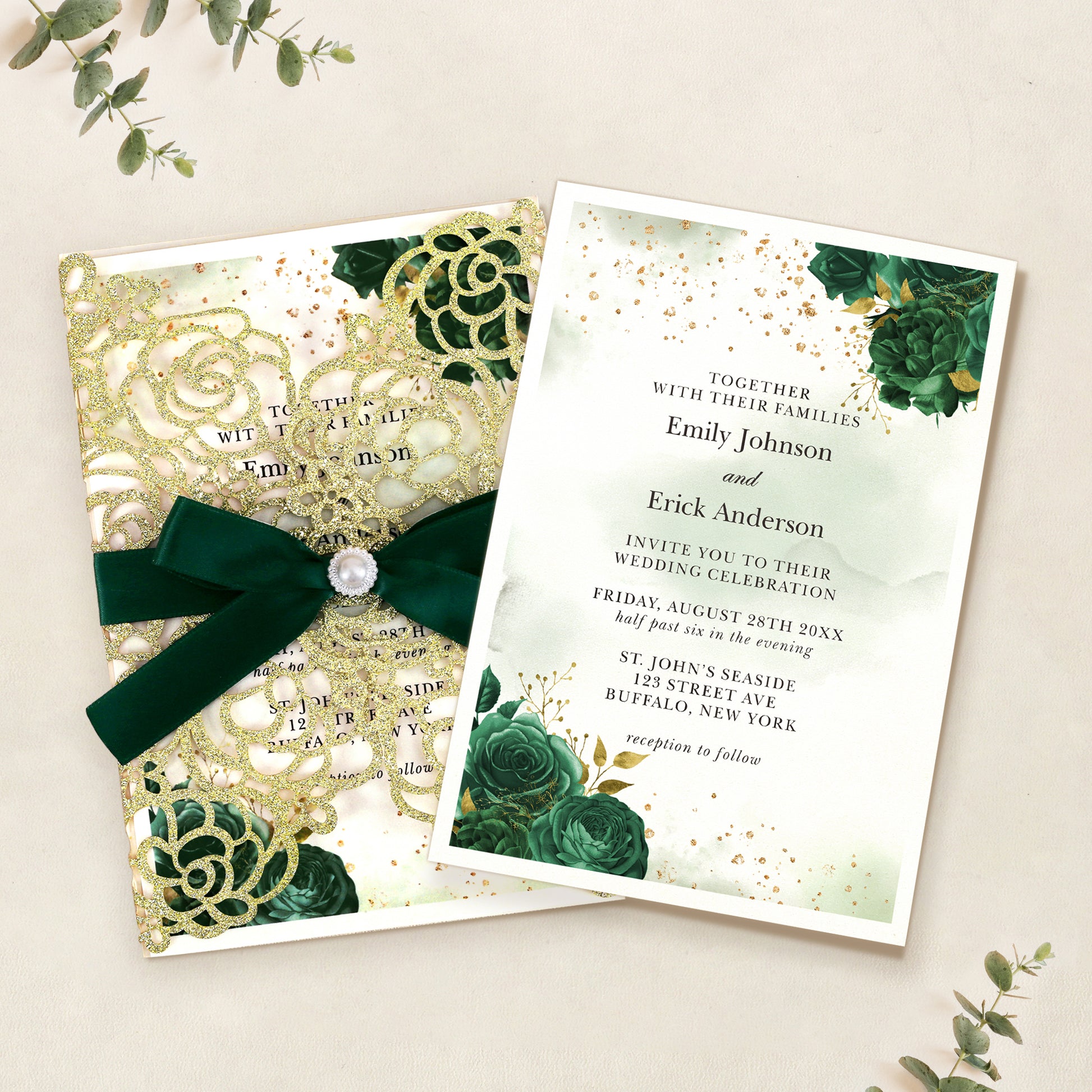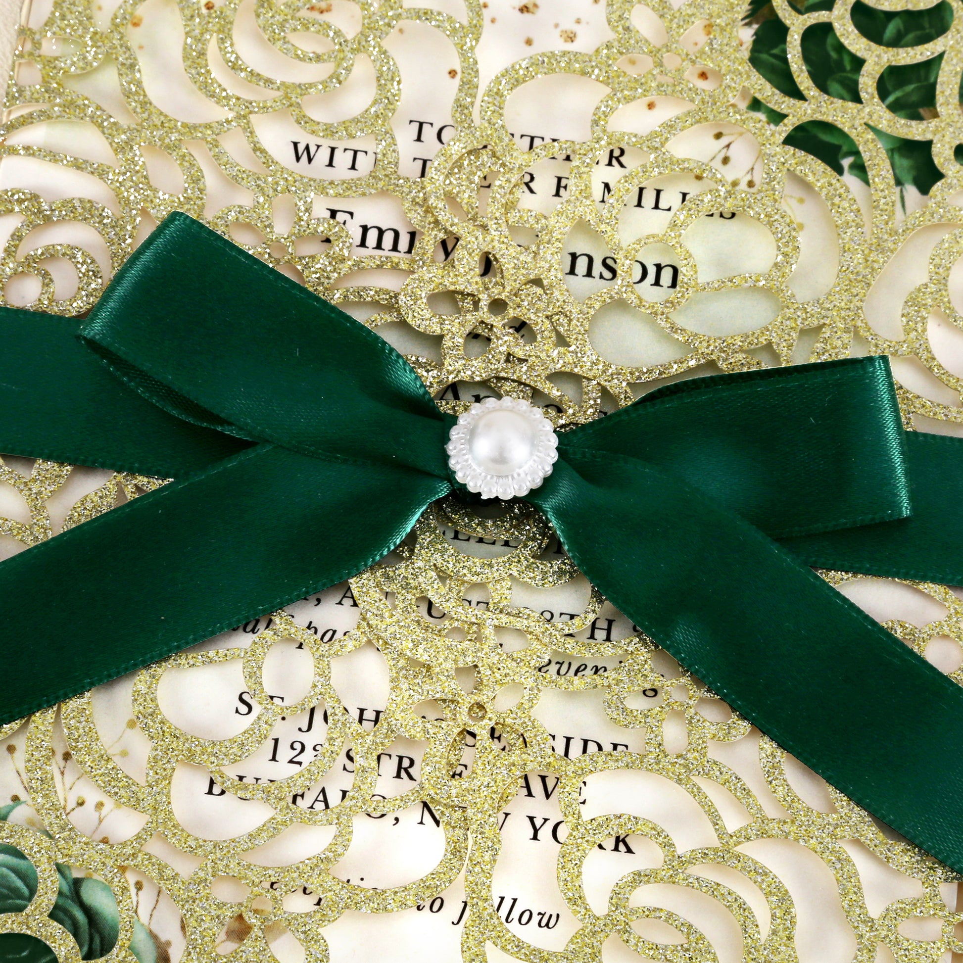 Gold Glitter Floral Laser cut invitation cards with Emerald Green Ribbon and Pearl for Wedding Anniversary