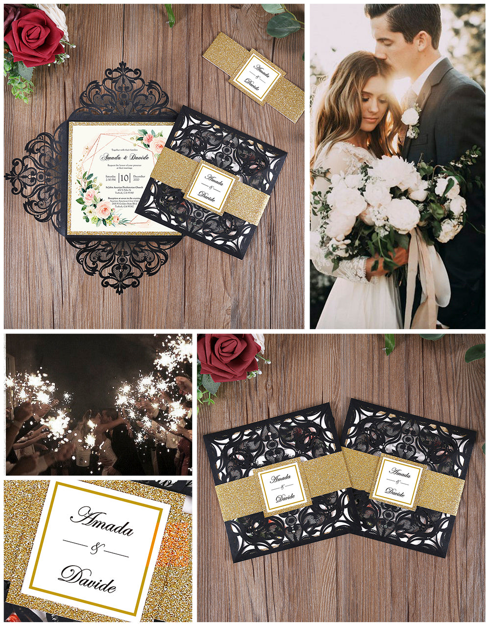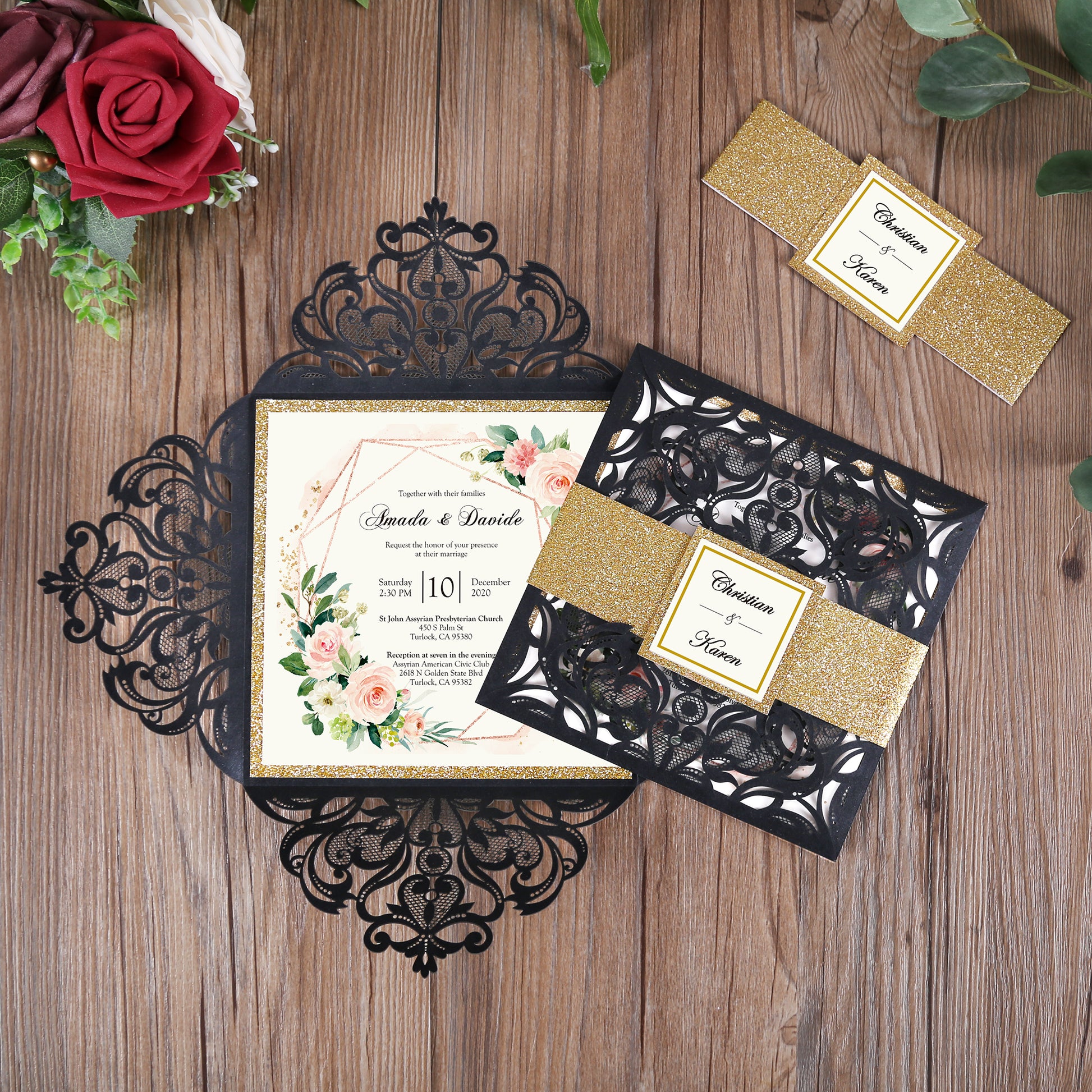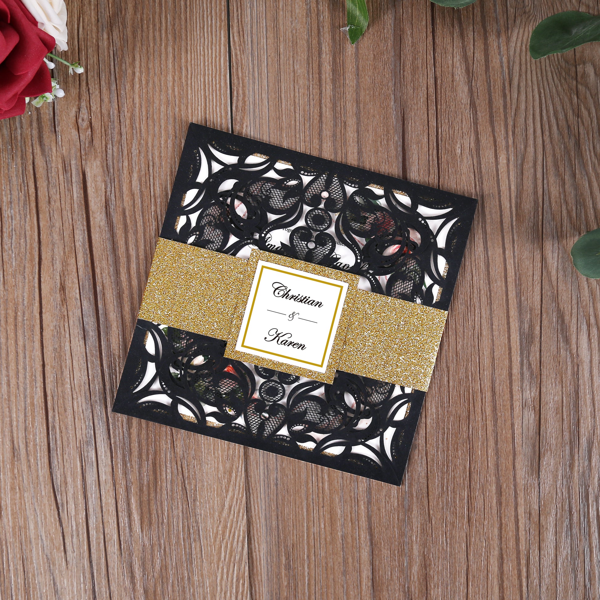 Square Black Laser Cut Lace Flower Invitations Cards