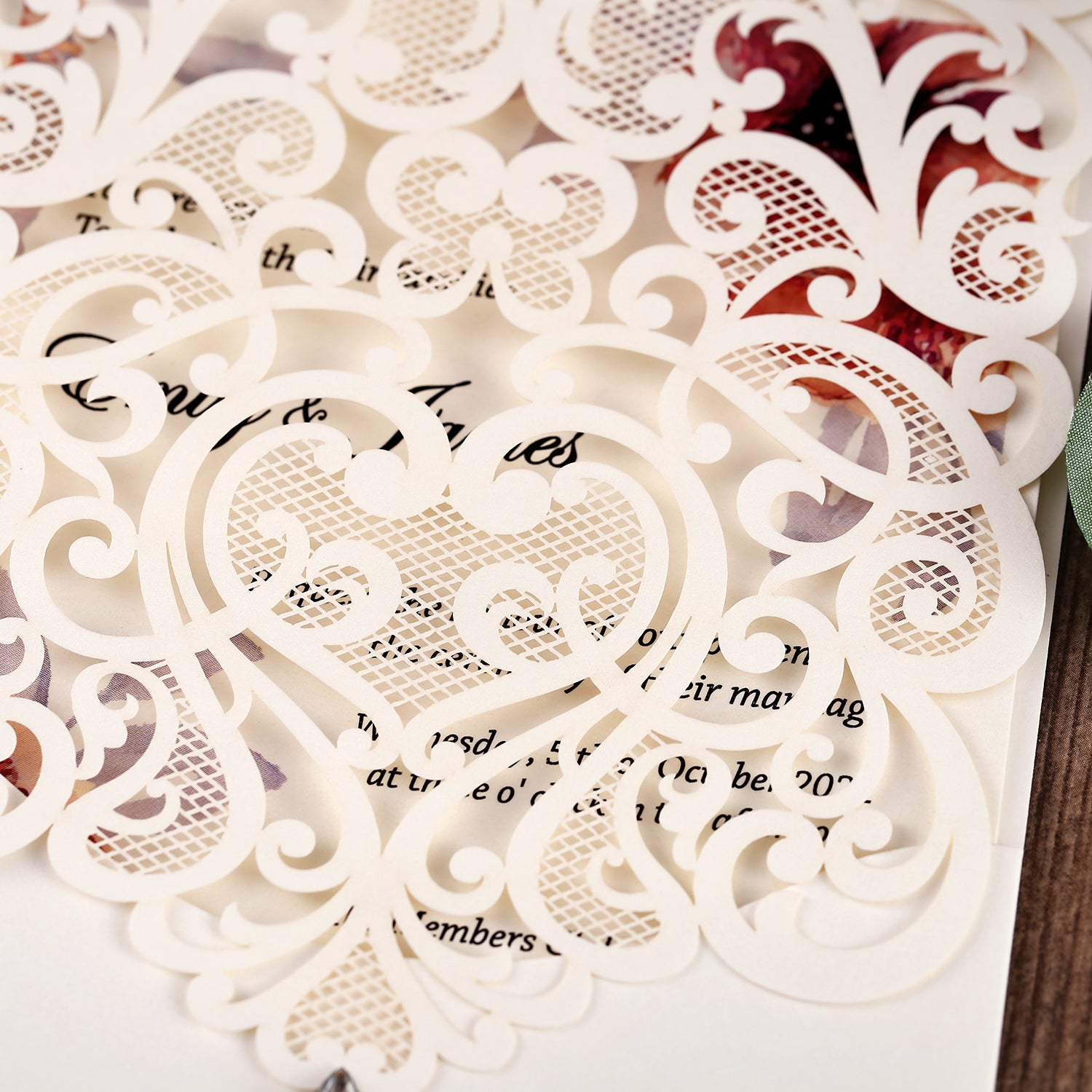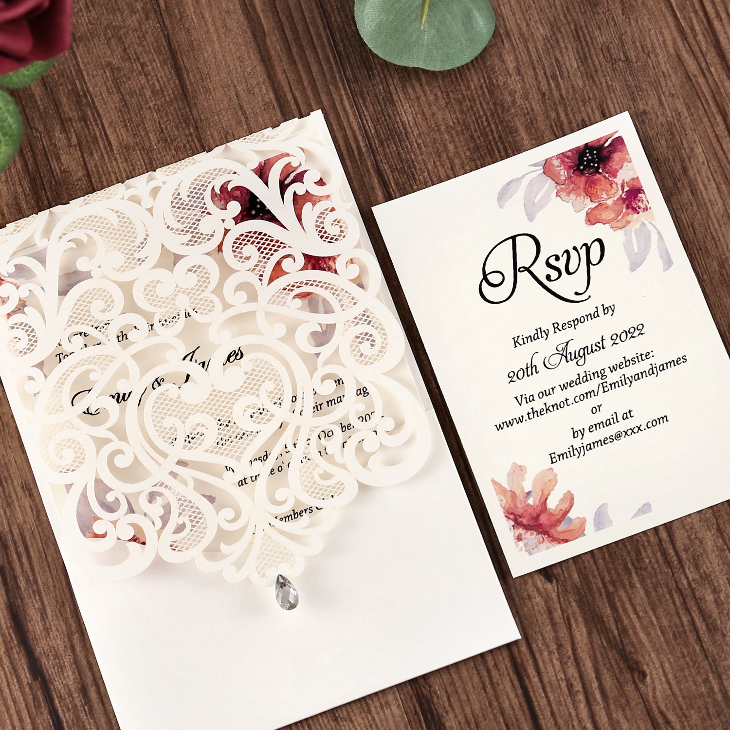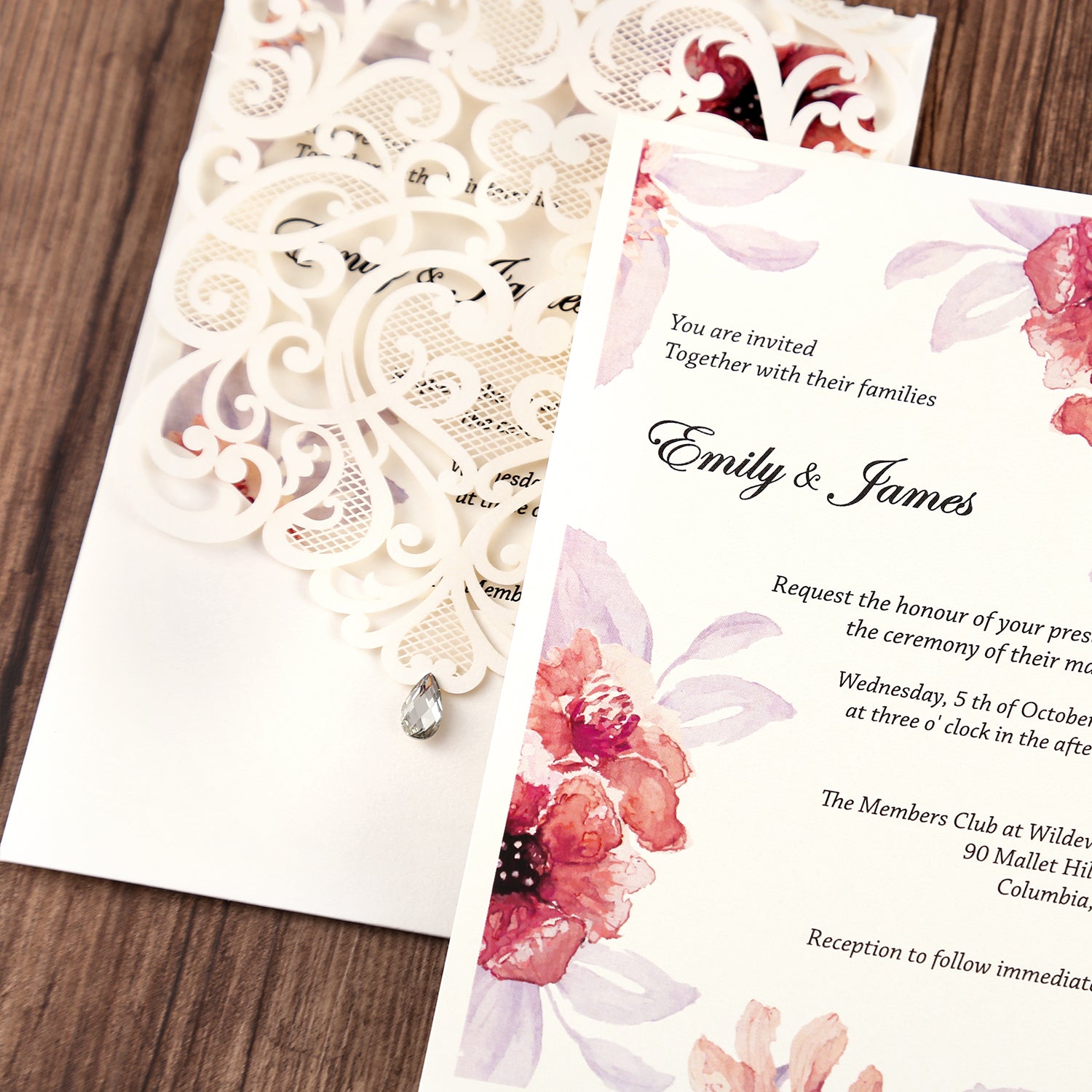 Vertical Ivory White Wedding Invitation With Rhinestone & Laser Cut Flower