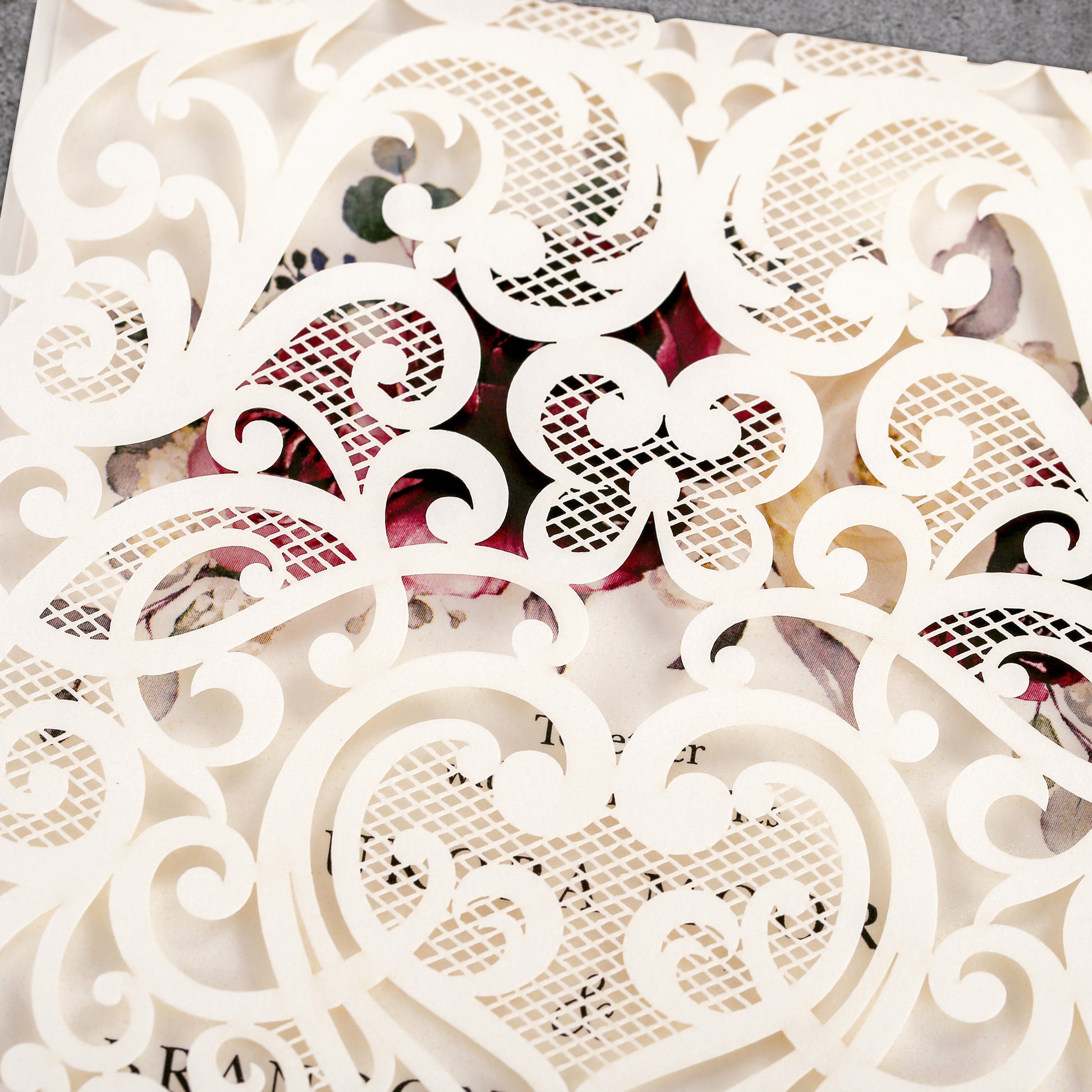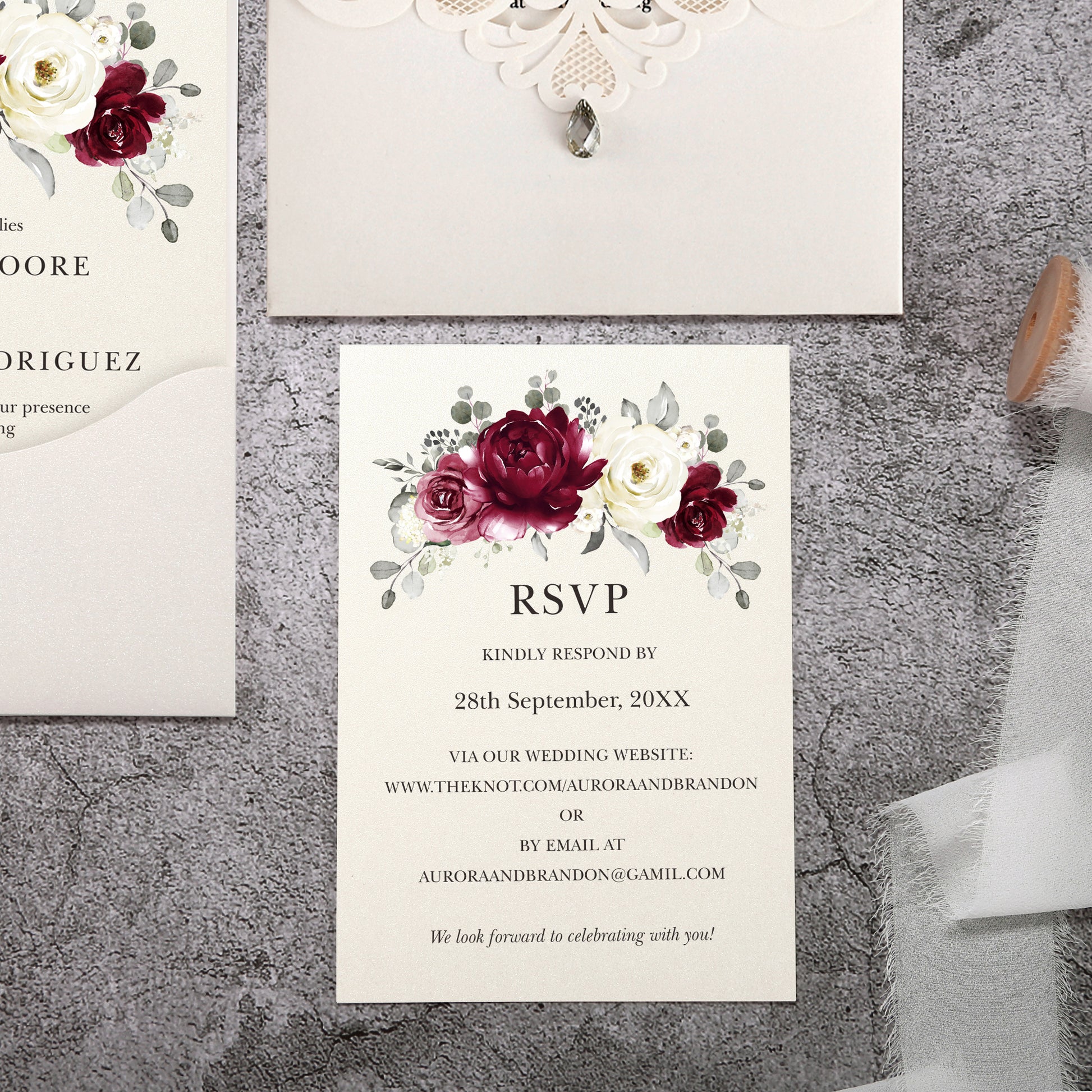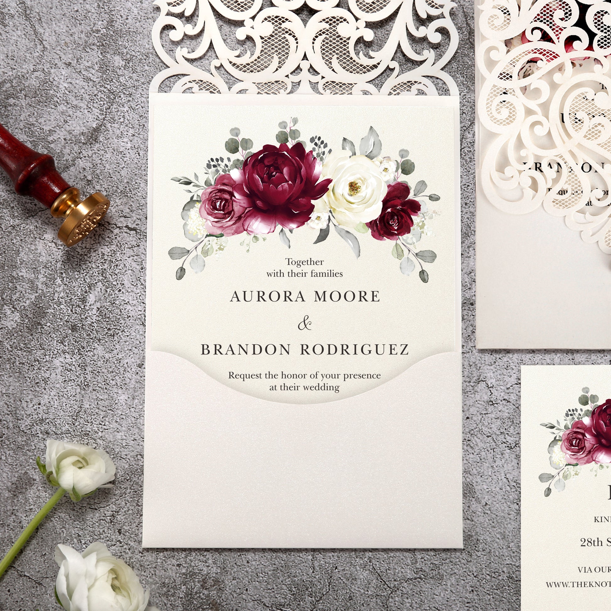 Vertical Burgundy Floral Laser cut invitations for Wedding Anniversary