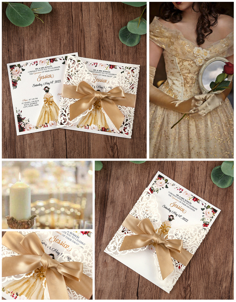Square Invitation Cards with Gold Ribbon For Quinceanera